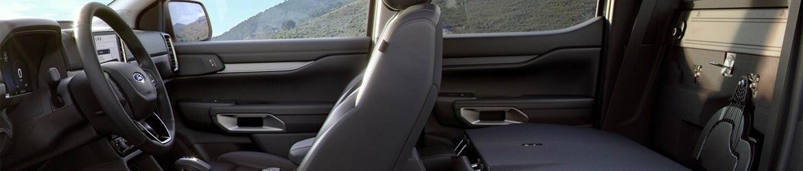 The interior of the 2025 Ford Ranger is designed for comfort and connectivity. It easily accommodates up to five passengers with modern, well-crafted seating, and for those looking for extra comfort and style, the Lariat trim offers heated, leather-trimmed seating, a heated steering wheel, and Dual-Zone automatic temperature control. The 10- or 12-inch infotainment display, equipped with Ford's SYNC 4 infotainment system, provides easy access to navigation, entertainment, and vehicle settings. Apple CarPlay and Android Auto compatibility ensures seamless smartphone integration, while the available B&O Sound System by Bang & Olufsen delivers premium audio quality.